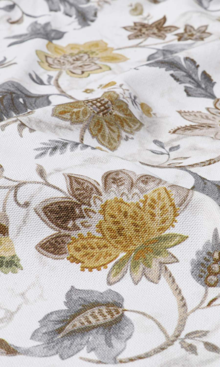 Subtle yet striking, this fabric brings traditional Indian floral motifs with curlicued details. Understated gray leaves recede to the background leaving the stage to delicate yellow-tinged flowers. Embodying eclecticism mixed with sobriety, Tunisia suits both detail-rich bohemian interiors and nature-inspired feminine spaces, embodying a blend of charm and subtlety.