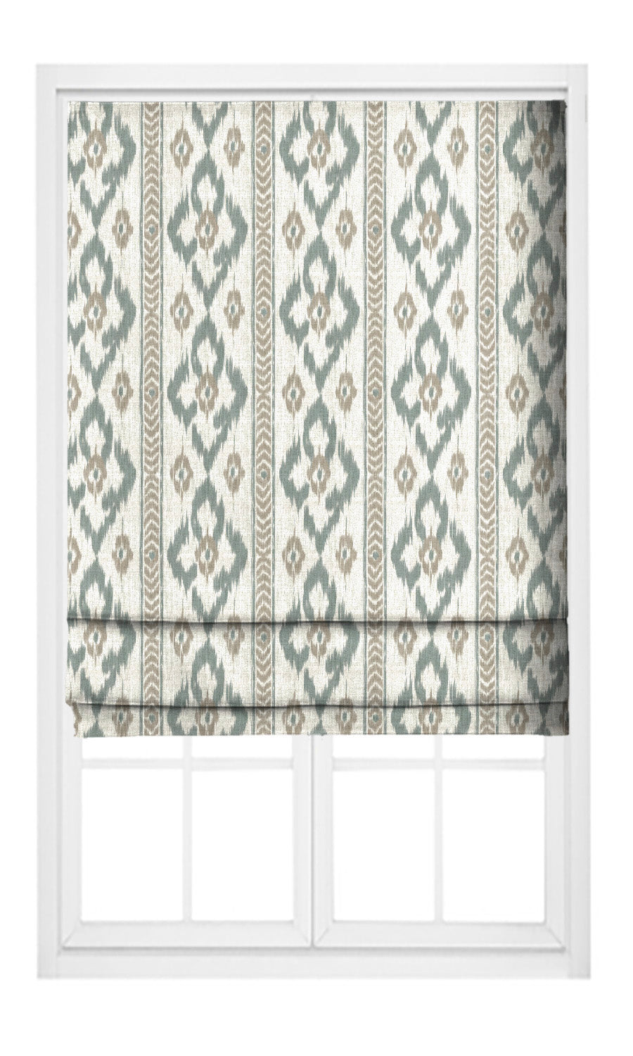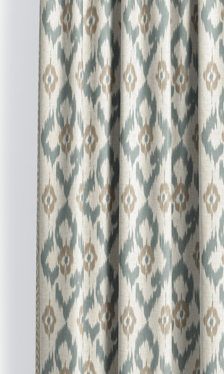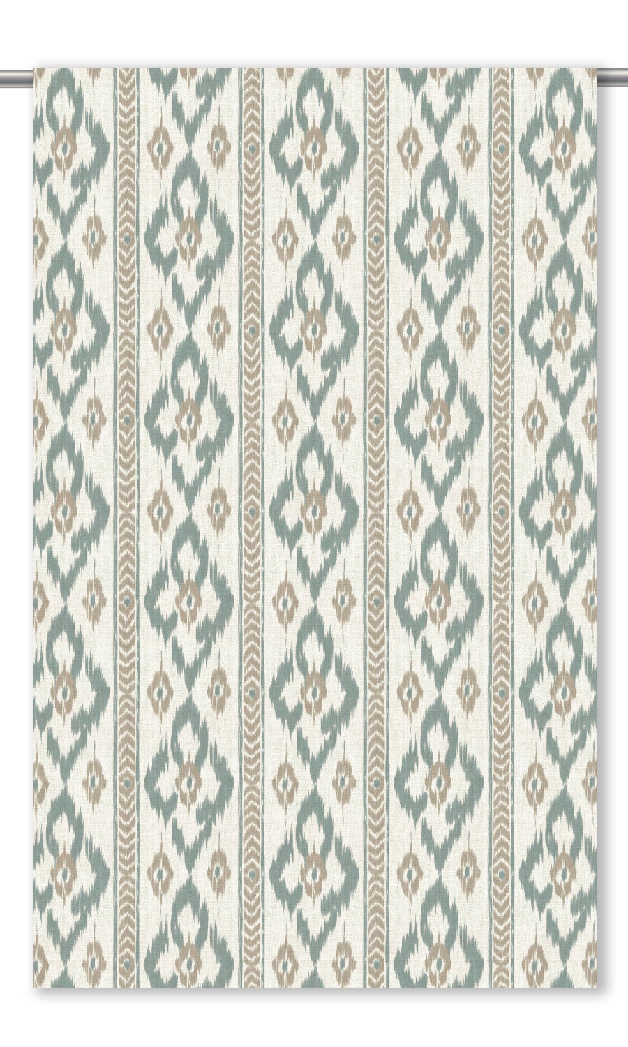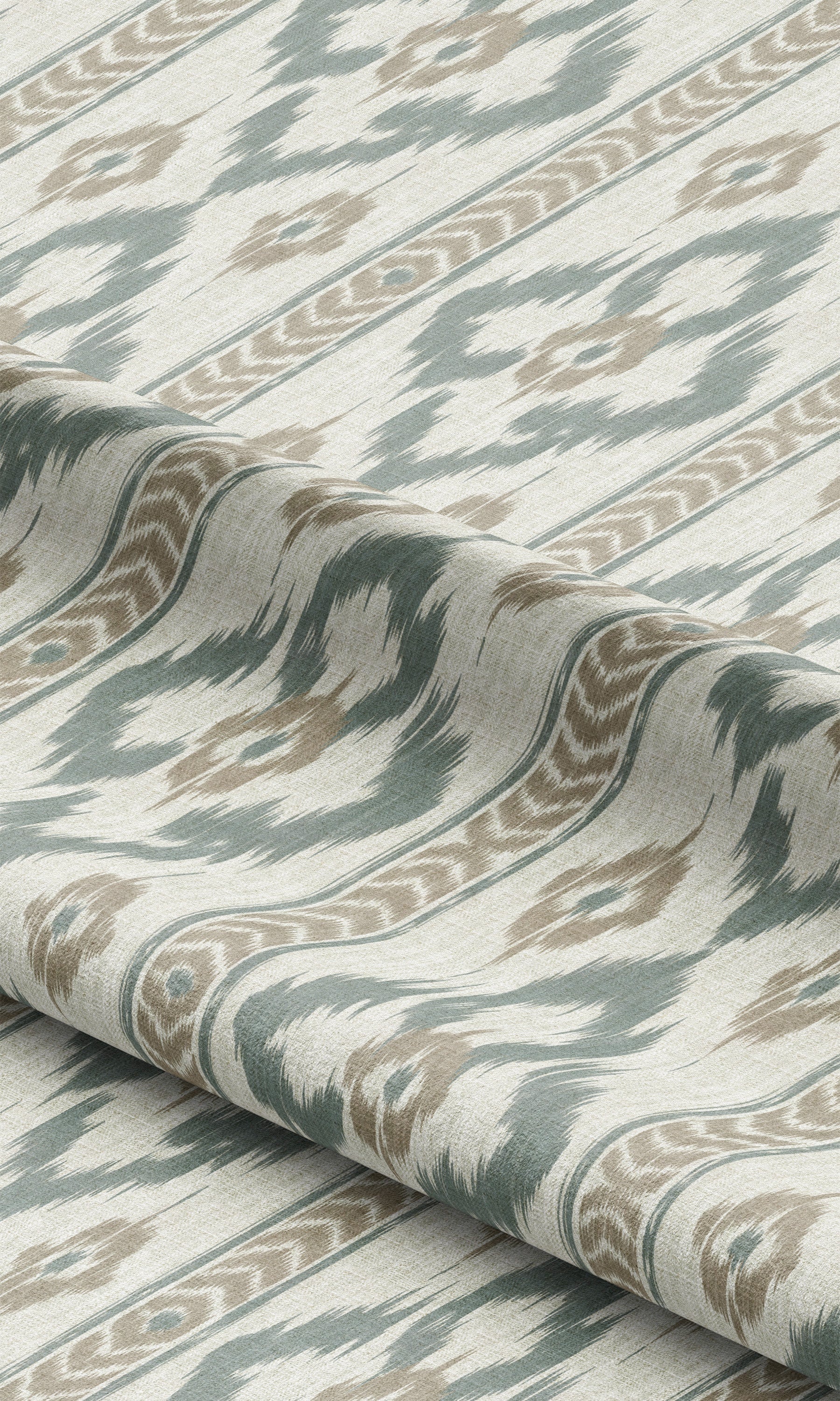 Its ikat geometric pattern where elaborate geometrics, interwoven with vertical stripes, and softened with blurred silhouettes, add depth and movement to the decor