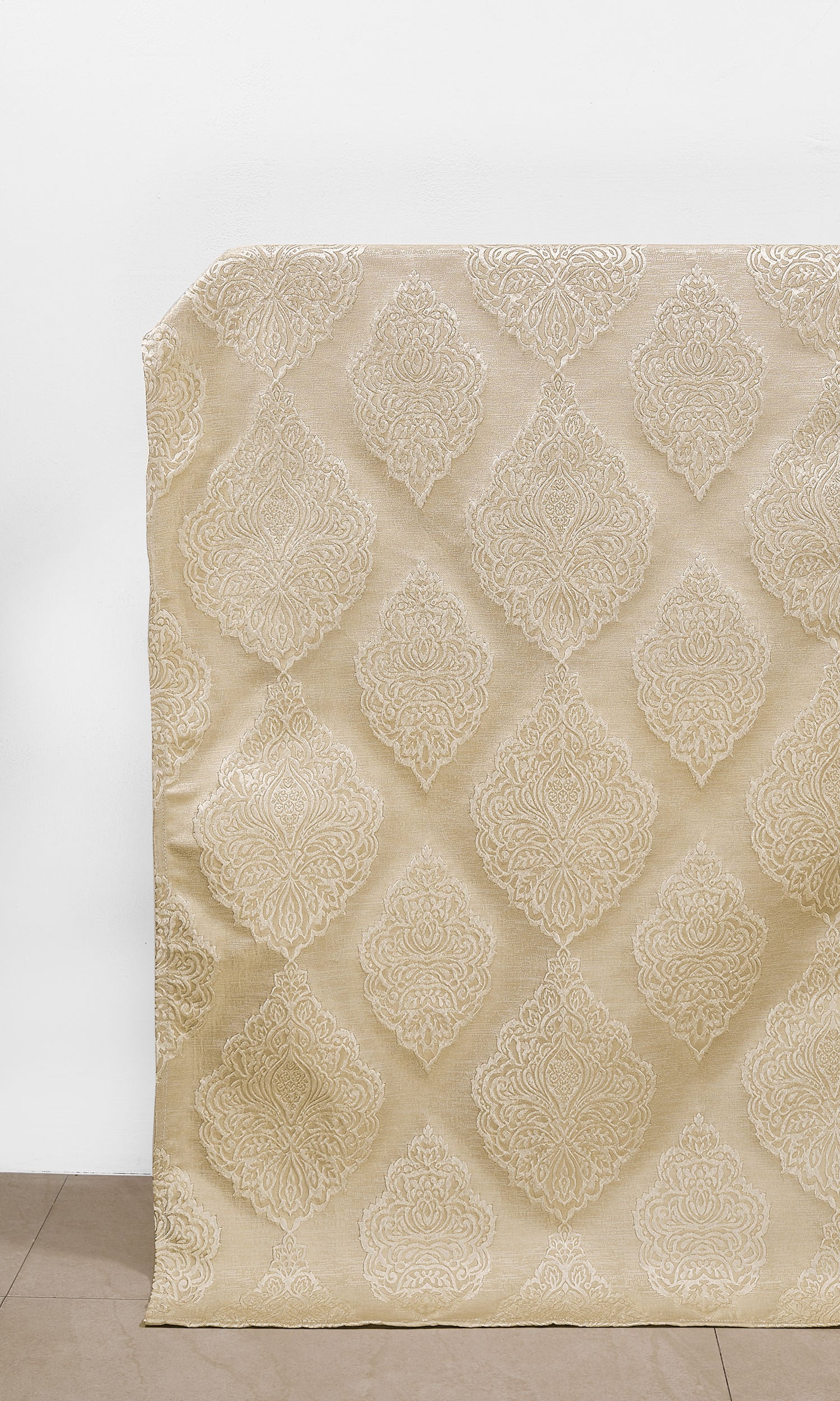 This Victorian-look fabric in soft beige and champagne gold has an elegant damask weave, classic foliage pattern, geometric placement and eye-catching emboss effect. The mild sheen and the textured effect give an aristocratic aura. A drape fit for a palace!