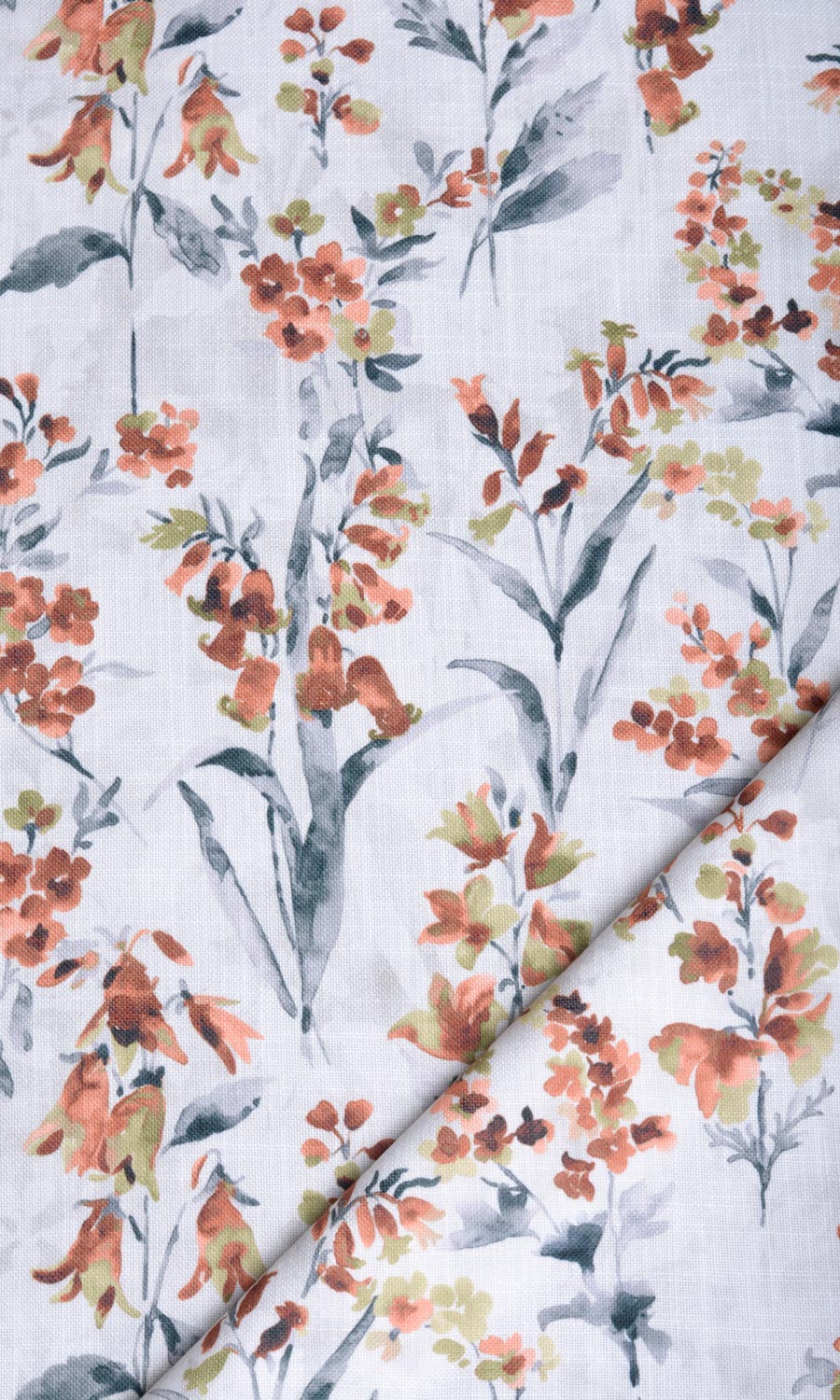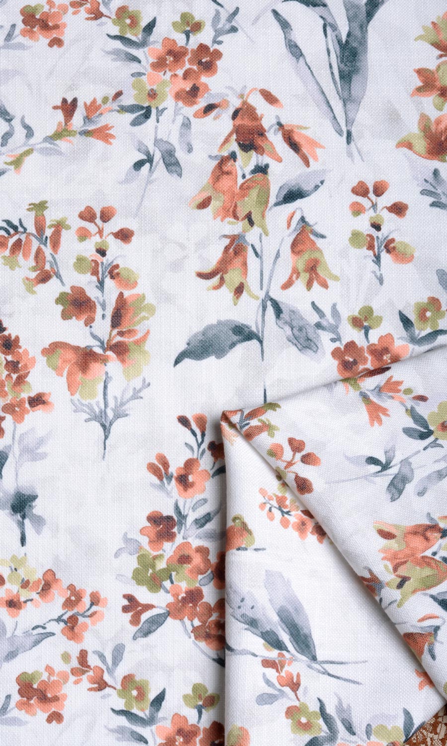 Bring the pleasance of nature into your home with this beautifully designed floral print fabric. The rejuvenating nature-inspired theme enables window treatments in this enchanting fabric to imbibe an outdoorsy experience. Featuring a modern take on florals with its contemporary color palette of white, orange, green and gray, this window dressing can mingle with many decor styles.