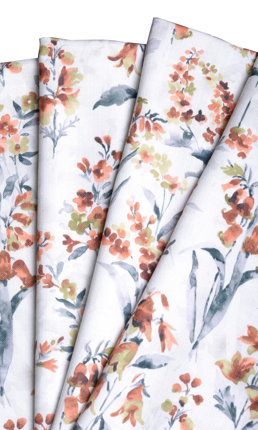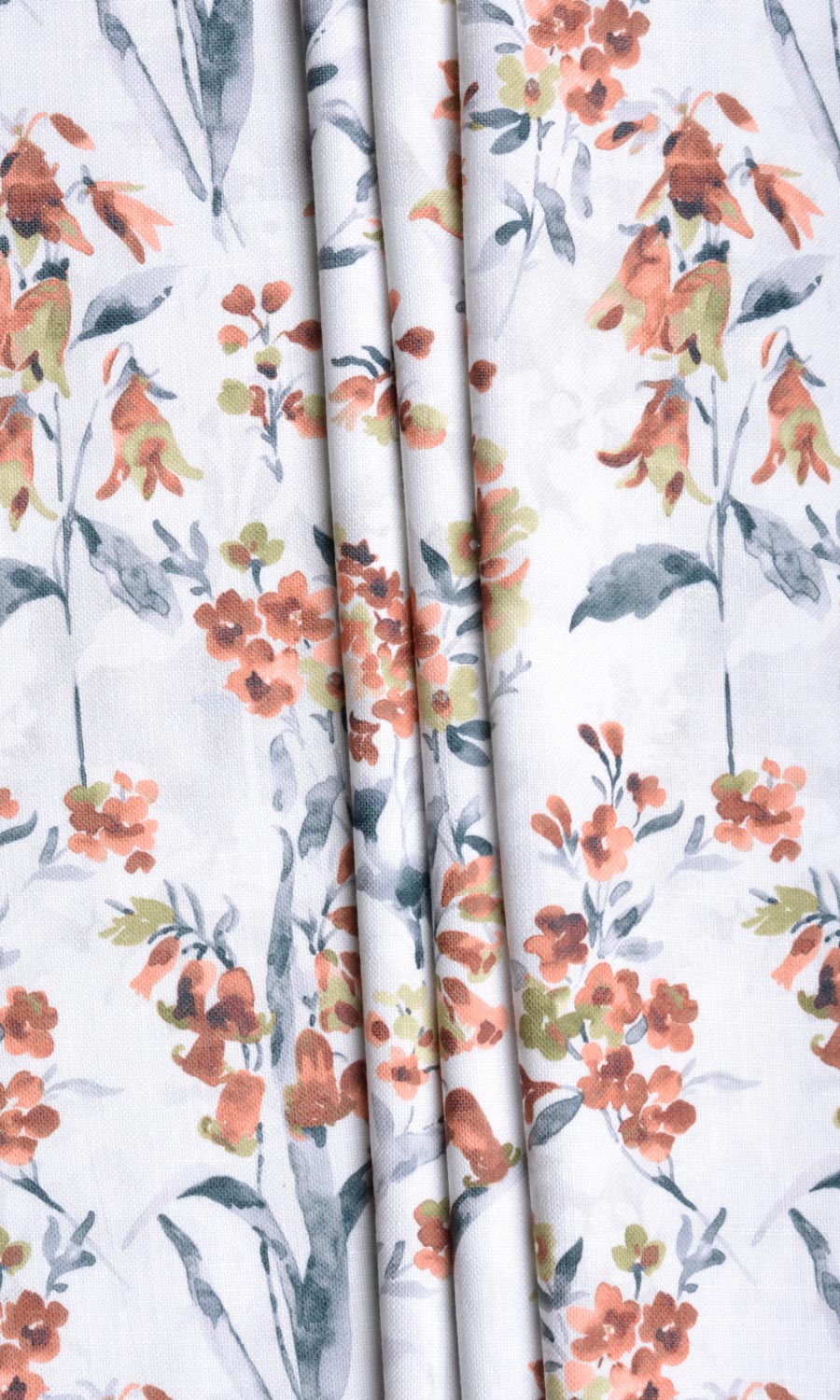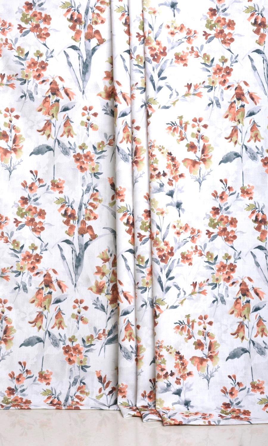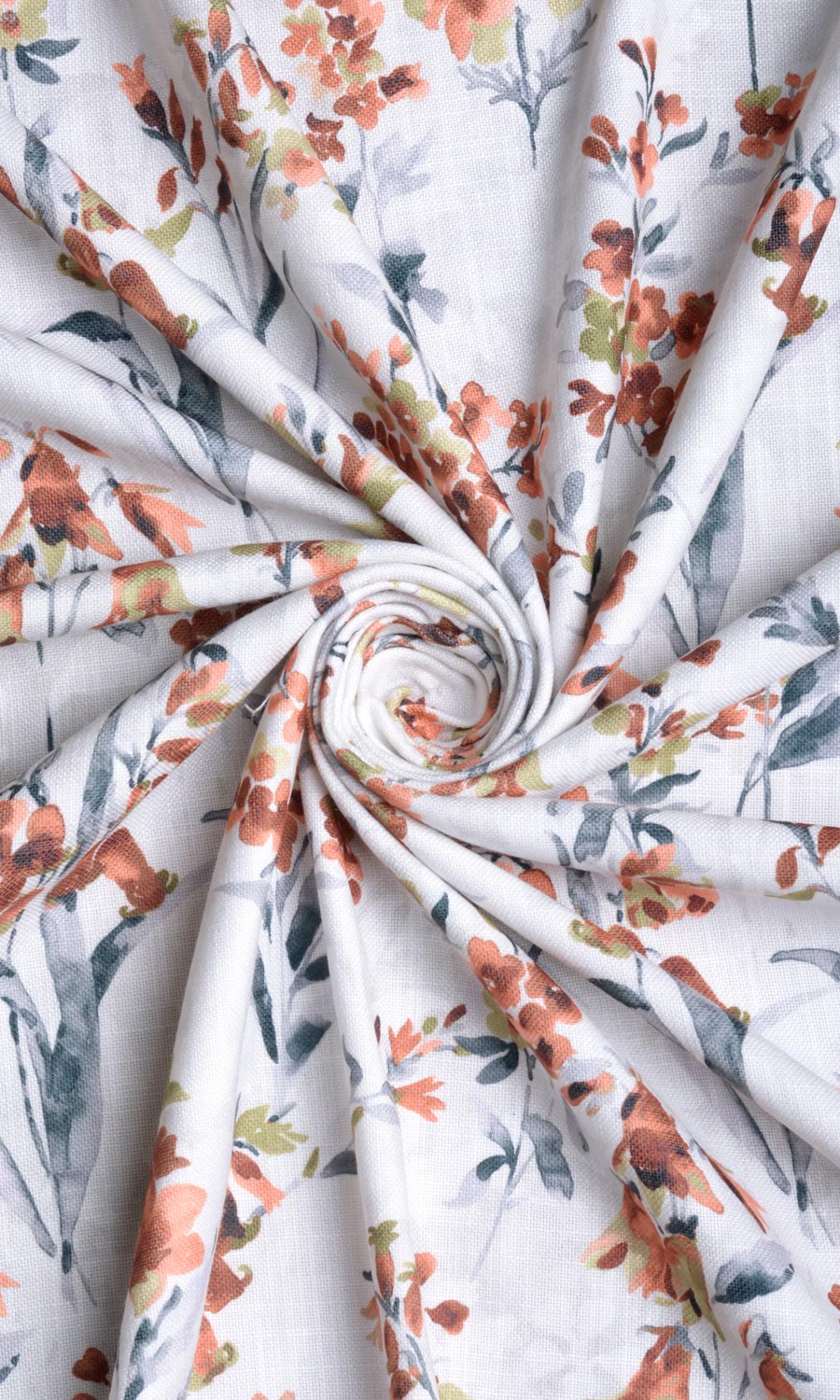 Bring the pleasance of nature into your home with this beautifully designed floral print fabric. The rejuvenating nature-inspired theme enables window treatments in this enchanting fabric to imbibe an outdoorsy experience. Featuring a modern take on florals with its contemporary color palette of white, orange, green and gray, this window dressing can mingle with many decor styles.