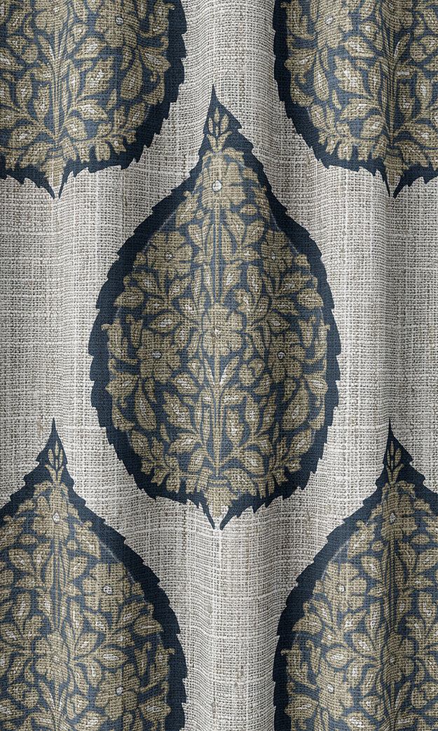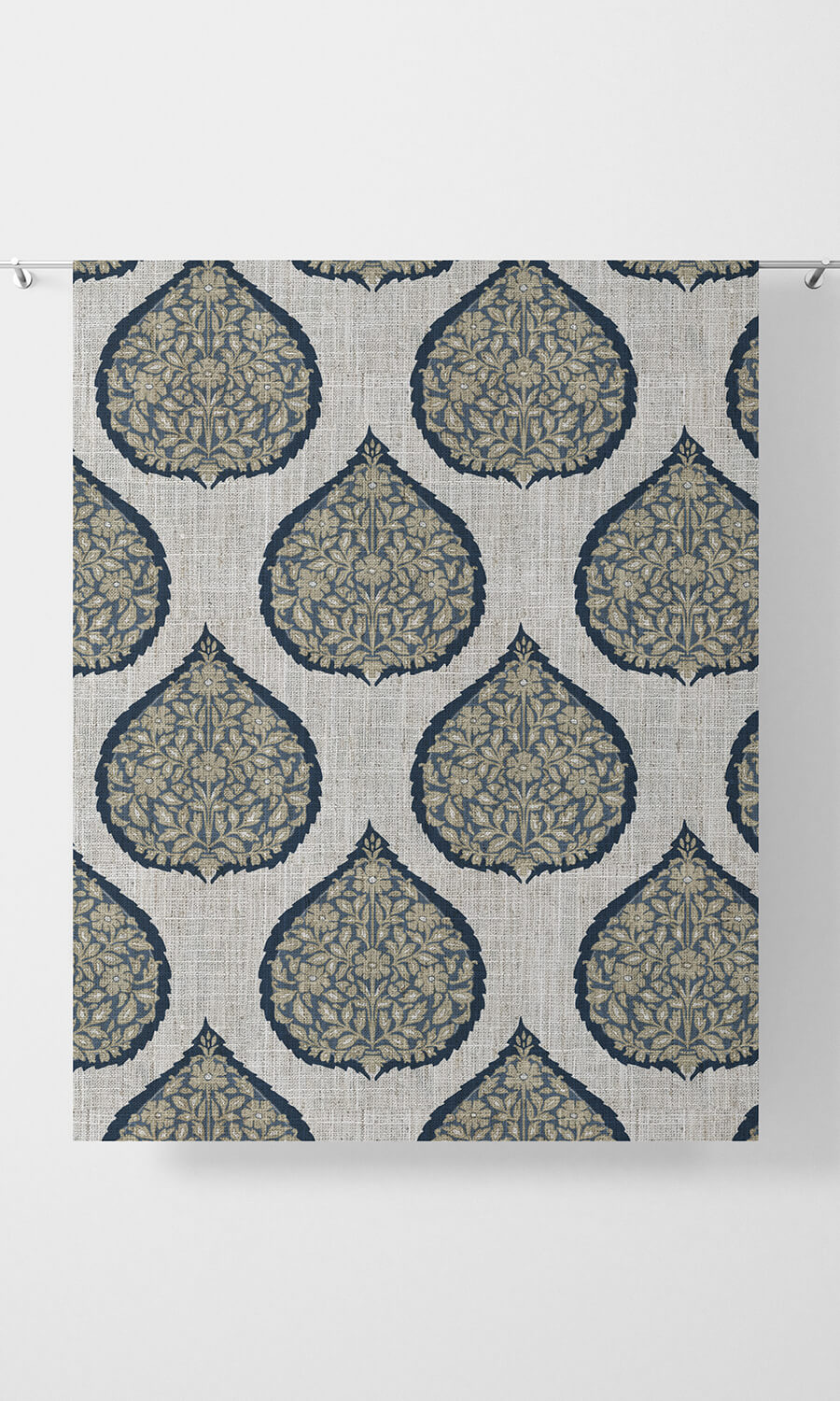 If you love the delightful medley of old and new, this fabric featuring the ancient Moghul motif in a sophisticated navy blue and greige palette is a must-buy. Grand cordate leaves engraved artfully with the narcissus shrub and juxtaposed with tiny flowers make for an arresting paisley-inspired window dressing. The scaling and the delicate intricacy doubly ensure that you’re signing in for a statement piece. And what better way to show off your love for oriental vintage art.