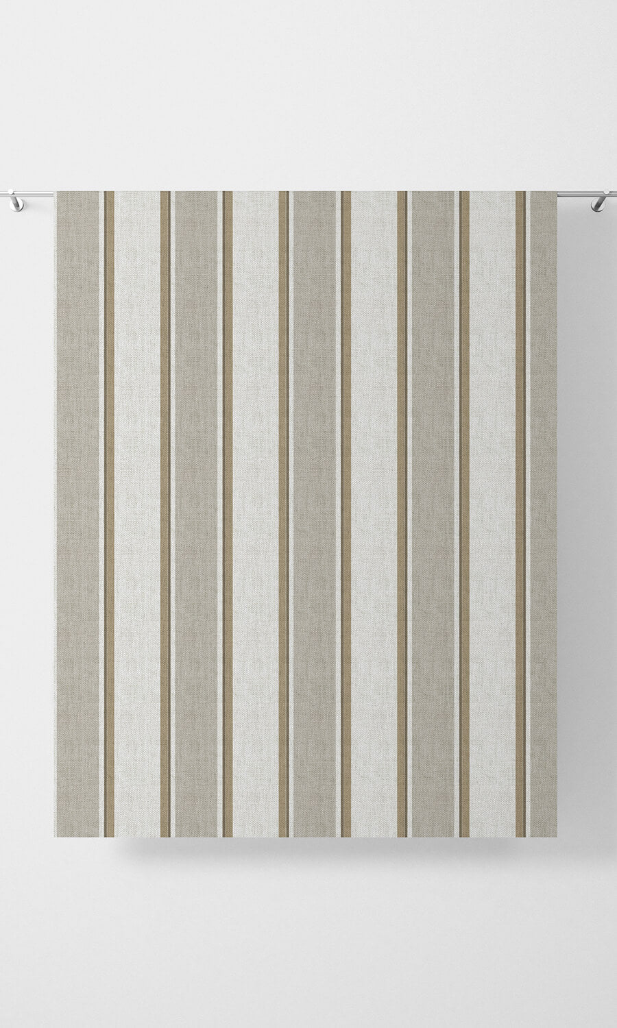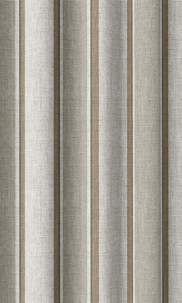 Designed with classic regency stripes in a soft color scheme of brown, greige and white, this fabric breathes simplicity and country vibes. The attention-raking scale of the pattern is complemented by an impressively calming palette. Elongate your space with elegant drapes and shades in this vertical striped fabric which can easily blend with any decor style.