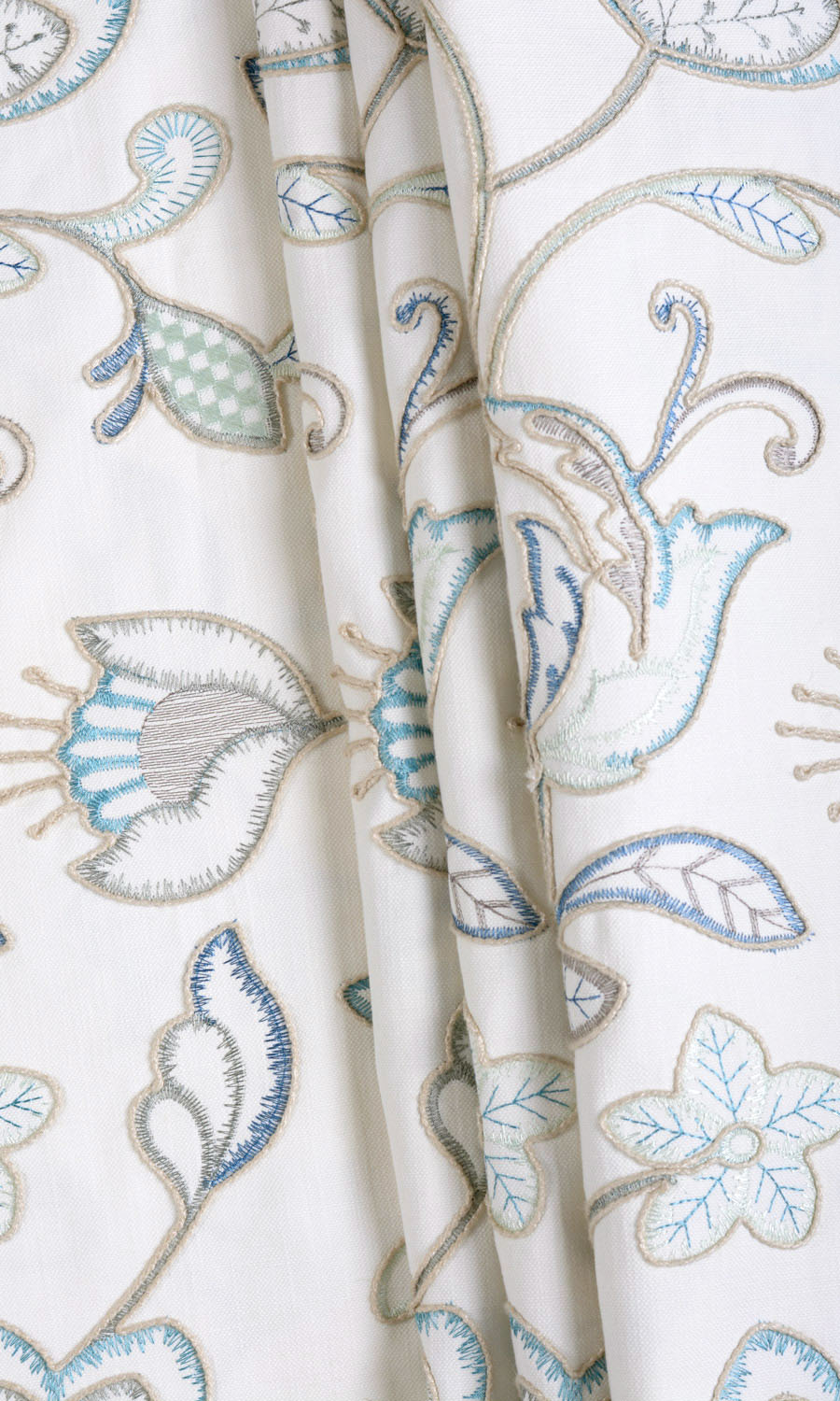 A dream in a drape. Its vast white expanse is embroidered with an all over pattern of flowers, buds, leaves, vines, and tendrils, all in hazelwood beige and indigo blue. Soothing to eyes, gorgeous to look at, and elegant in any space, that's Winter Chill for you.