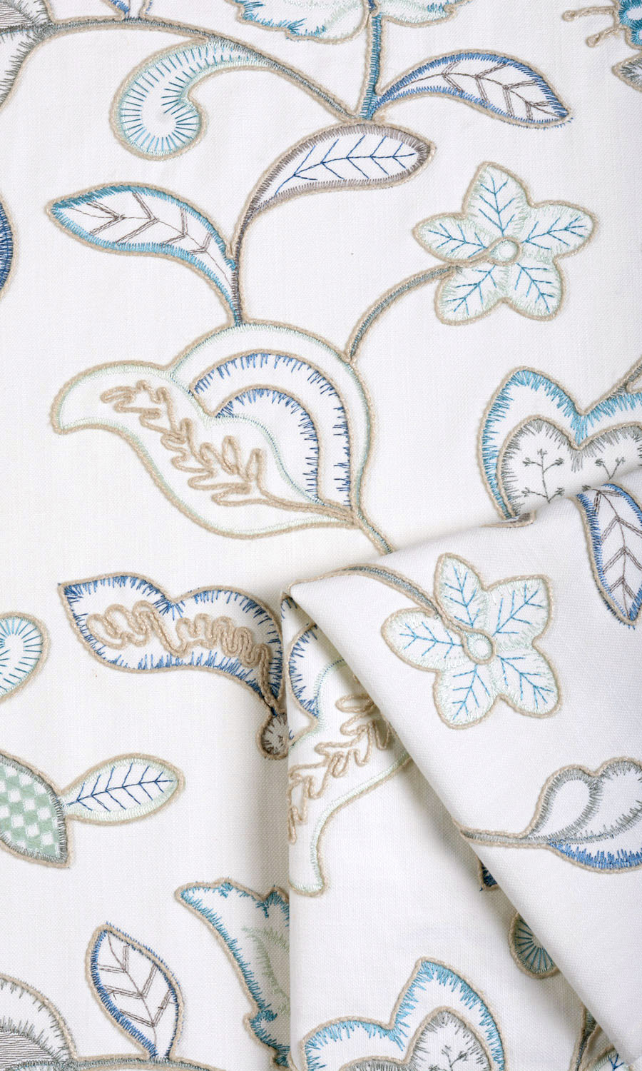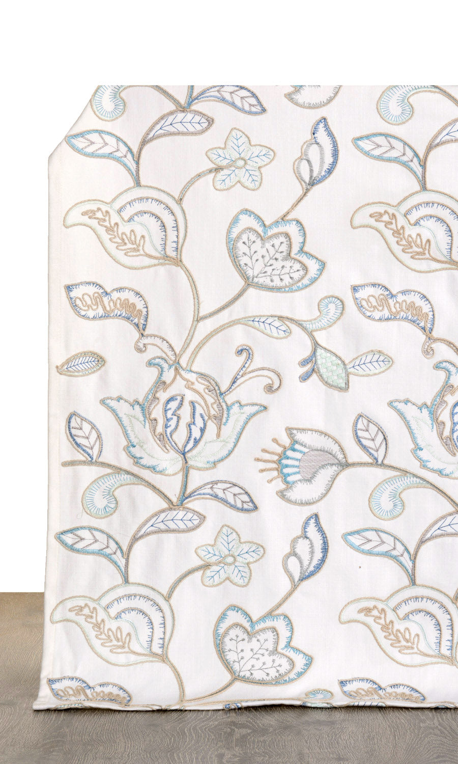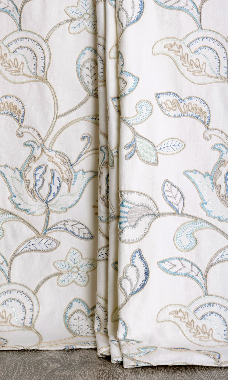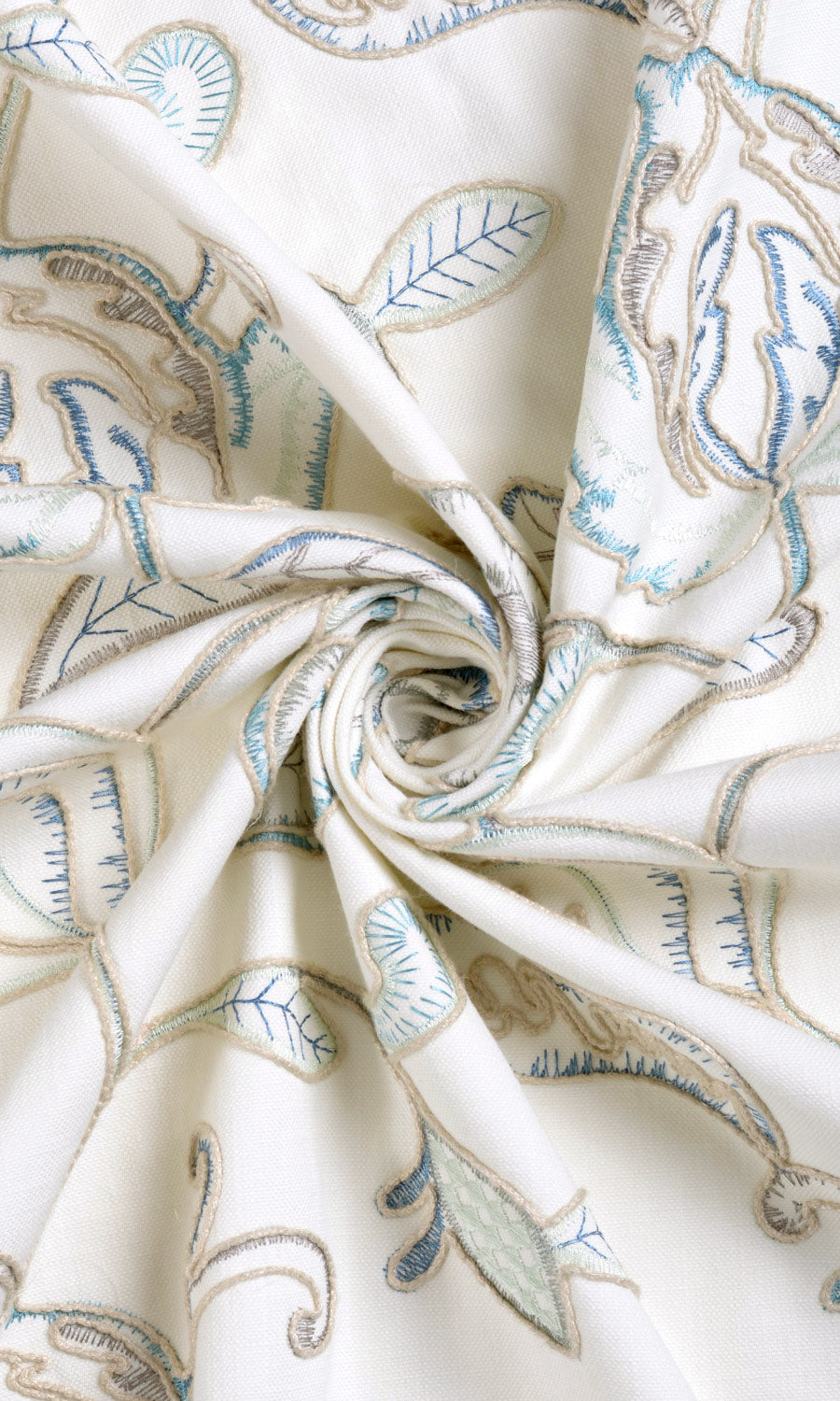 A dream in a drape. Its vast white expanse is embroidered with an all over pattern of flowers, buds, leaves, vines, and tendrils, all in hazelwood beige and indigo blue. Soothing to eyes, gorgeous to look at, and elegant in any space, that's Winter Chill for you.