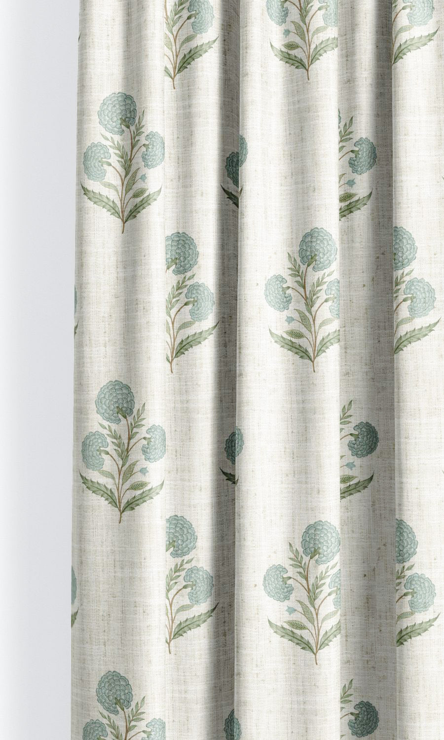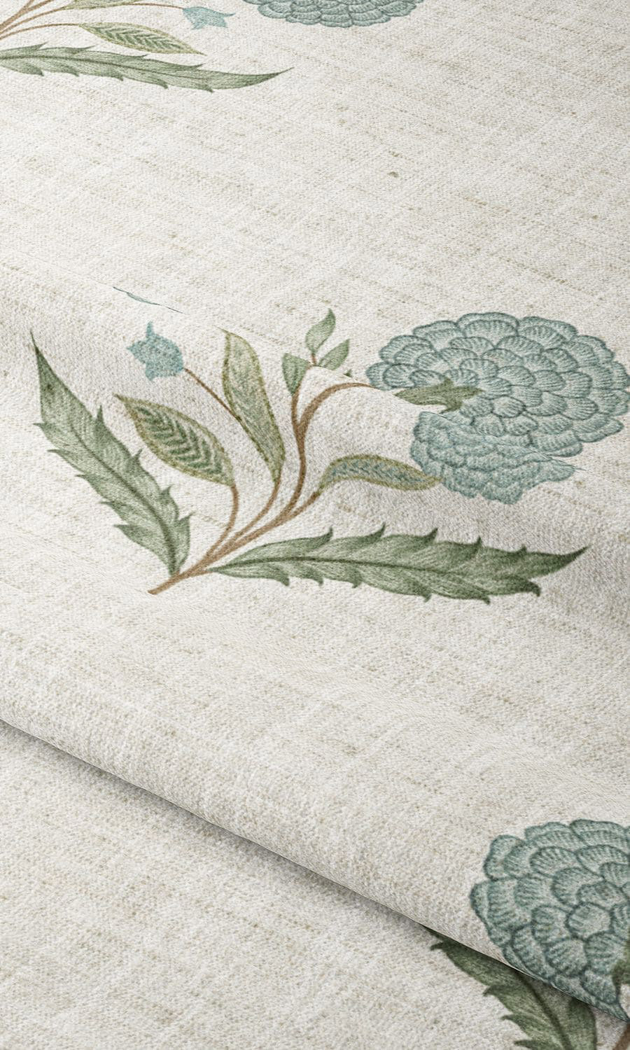 - Pastel blue and olive green unfurl on linen-textured cream, bringing cozy cottage warmth to every sunlit window