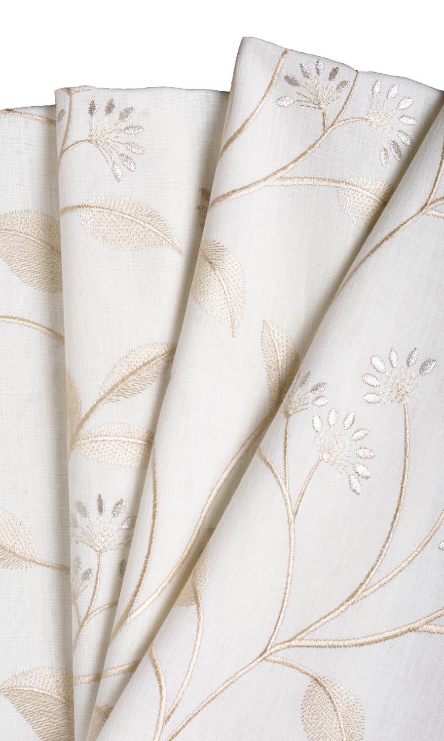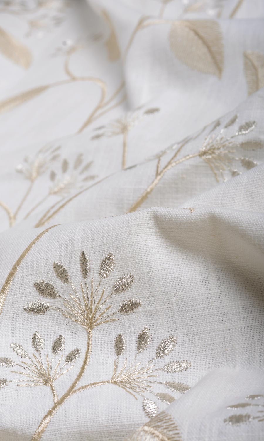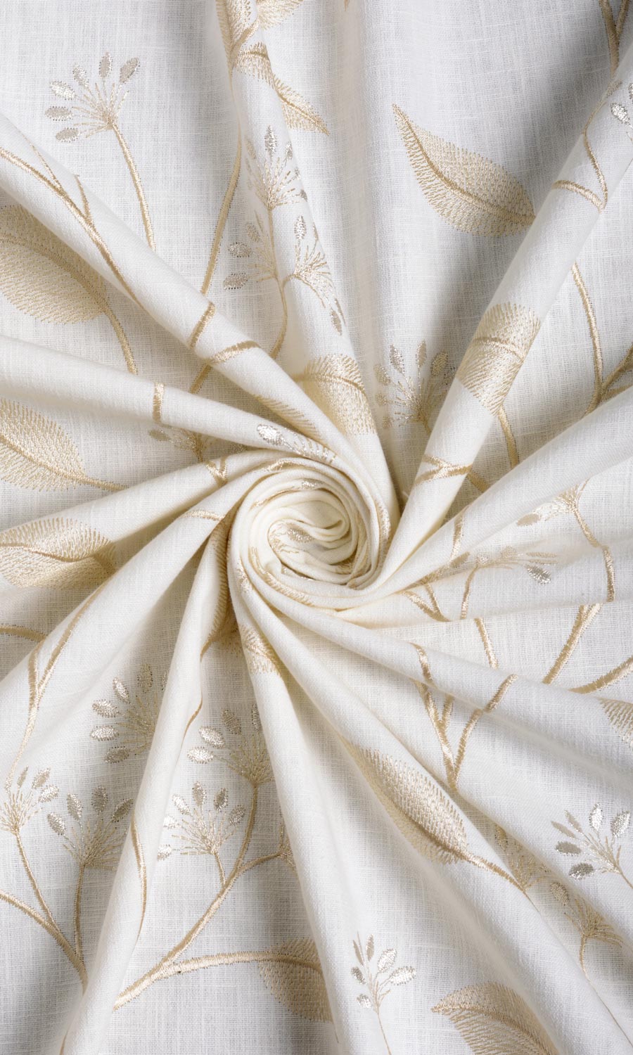 Speaking more with few words, this cream drapery fabric presents floral motifs with subtle contrasts and artistic finesse. Leaves and blooms on slender stalks, embroidered delicately in tones of ivory, give off the sophisticated flair of the nature theme impressively. The neutral palette ensures easy blending with diverse color schemes and decor styles.
