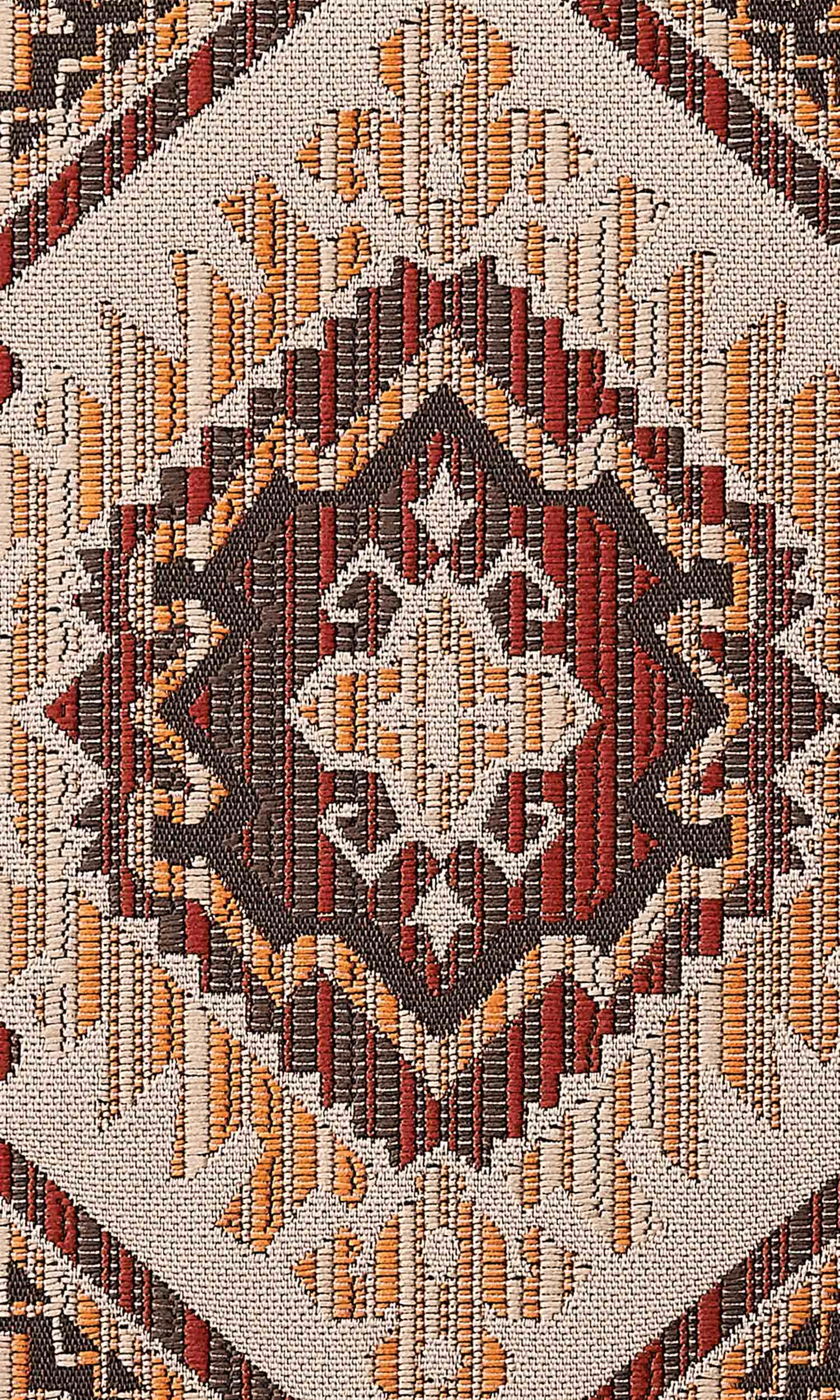 This eye catching fabric has been jacquard woven in a stunning Aztec inspired pattern. The intricate weave in earthen palette of burnt umber brown, russet red and deep yellow on a white background creates a splendid visual effect. Perfect for formal spaces!
