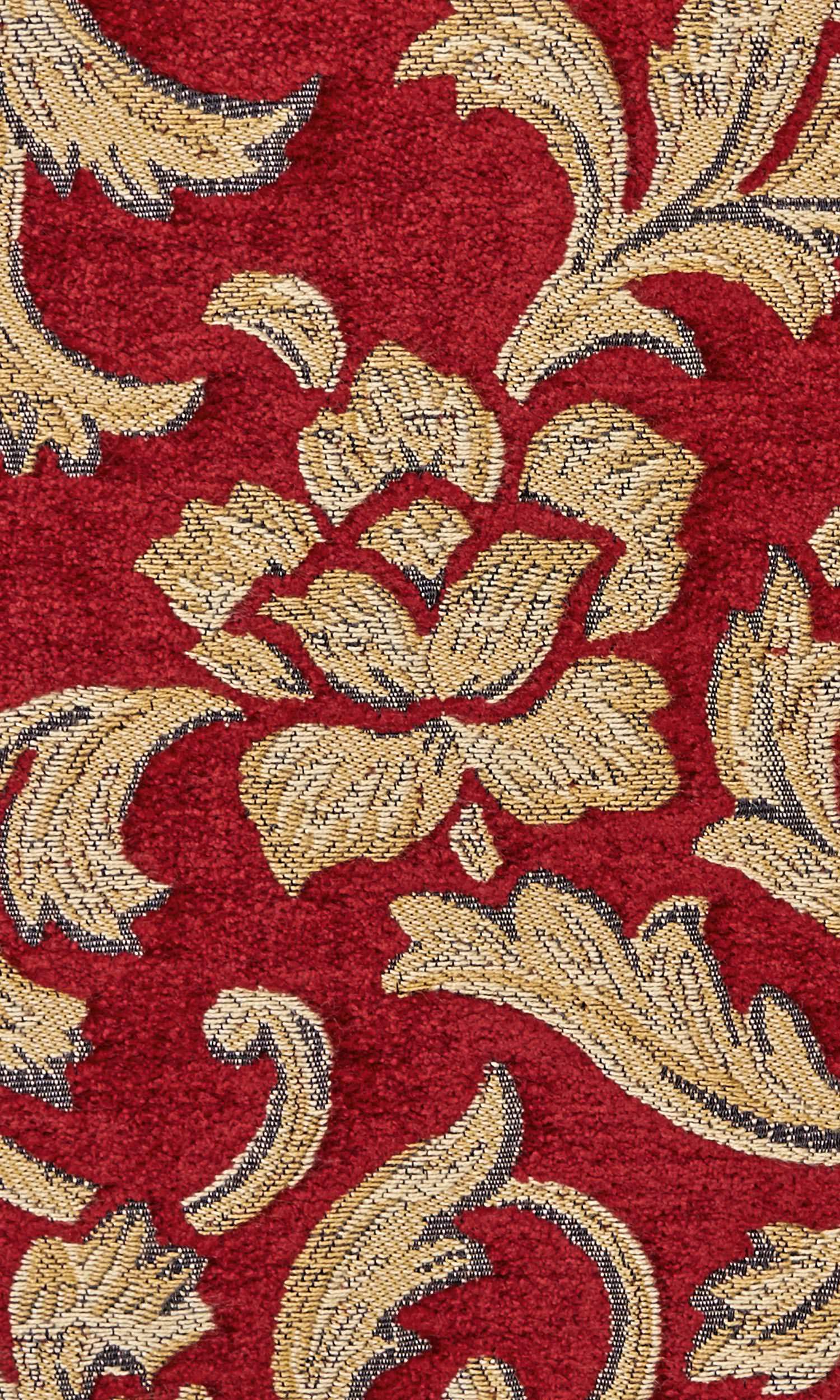 This jacquard fabric in bold red and gentle beige features a voluptuous woven floral pattern. A vintage look, velvet pile feel and vivid color palette make this fabric the first choice of those who want a touch of royal ambience in their spaces.