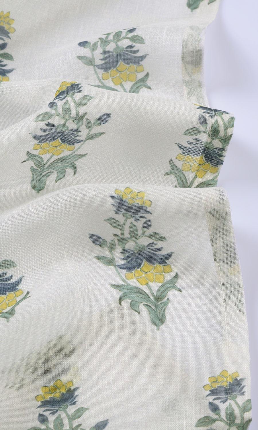 Epitome of floral allure! Exemplar of gracefulness and daintiness! Floral sprigs in tender shades of yellow, blue and green on a gauzy cream backdrop make a winsome visual treat in Zehab. It can make your boudoir dreamy, your bohemian sweet digs a true bliss, and guest bedroom a wanton escape. Pair with solid yellow/blue drapes and amplify that enchanting gorgeousness.
