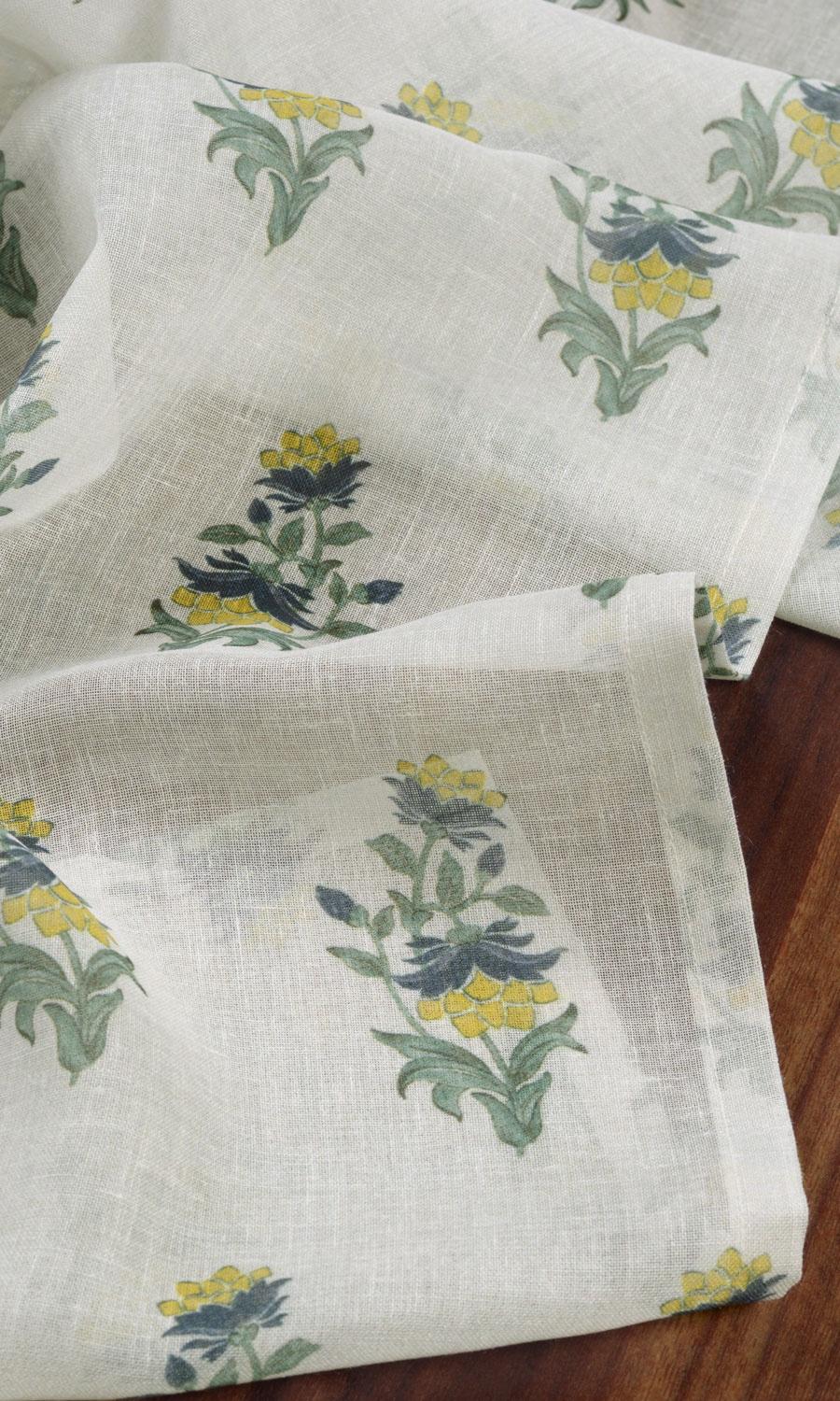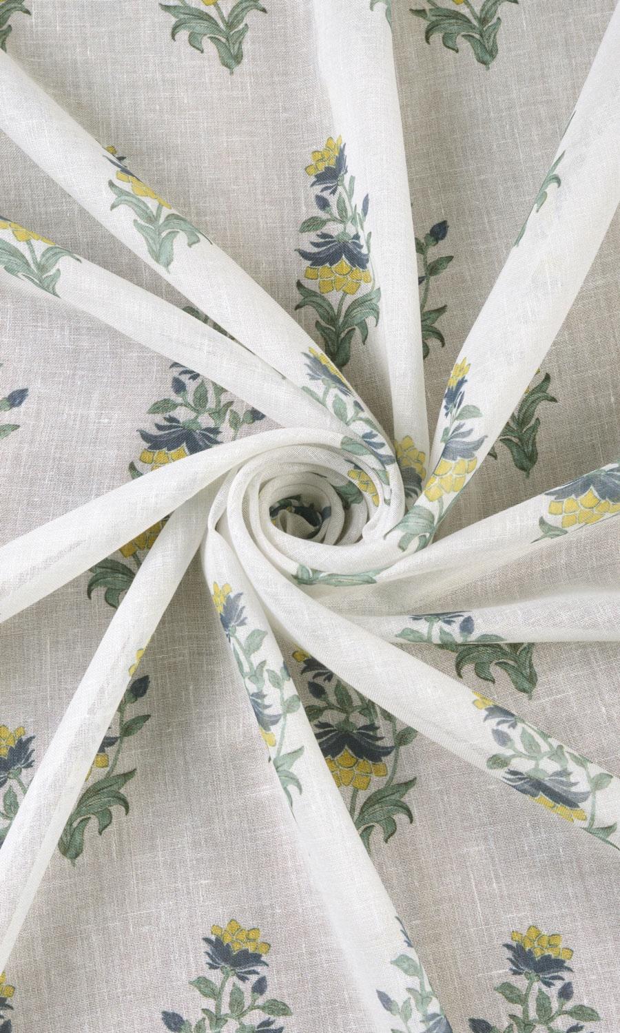 Epitome of floral allure! Exemplar of gracefulness and daintiness! Floral sprigs in tender shades of yellow, blue and green on a gauzy cream backdrop make a winsome visual treat in Zehab. It can make your boudoir dreamy, your bohemian sweet digs a true bliss, and guest bedroom a wanton escape. Pair with solid yellow/blue drapes and amplify that enchanting gorgeousness.