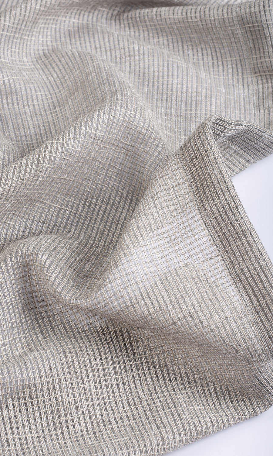 Muted hue, ringing texture! A one-of-a-kind grey sheer that is not shy of drama even as it speaks in whispers. Its chunky check weave offers a subtle pattern and paints the interiors with moire shadows as light makes its way through the somber veil. Just the right bit of detail and understated elegance that a modern living room or a glam bedroom is looking for.