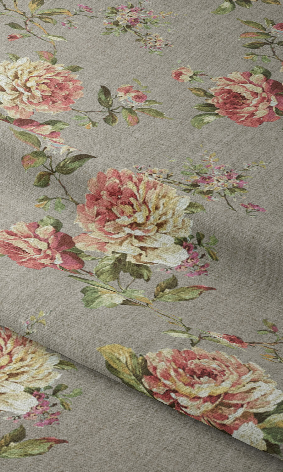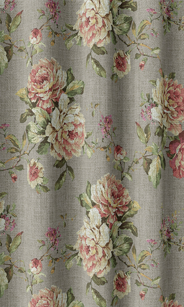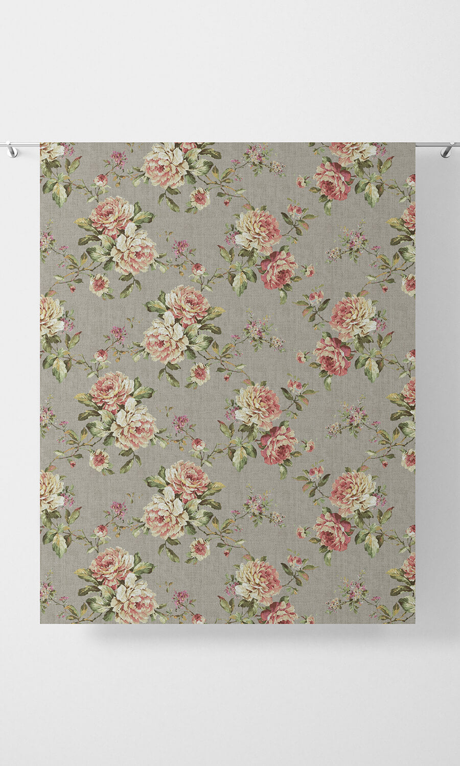 Brighten your home with the freshness of a Spring morning! Set in a pale grey backdrop, the blush roses featured on this fabric can bring the serenity of a blooming garden indoors. The vintage French floral pattern paired with a modern color palette makes window treatments in Zion a timeless decor element. Drapes and roman shades stitched of this lovely fabric promise to render softness and feminine touch to any interior.